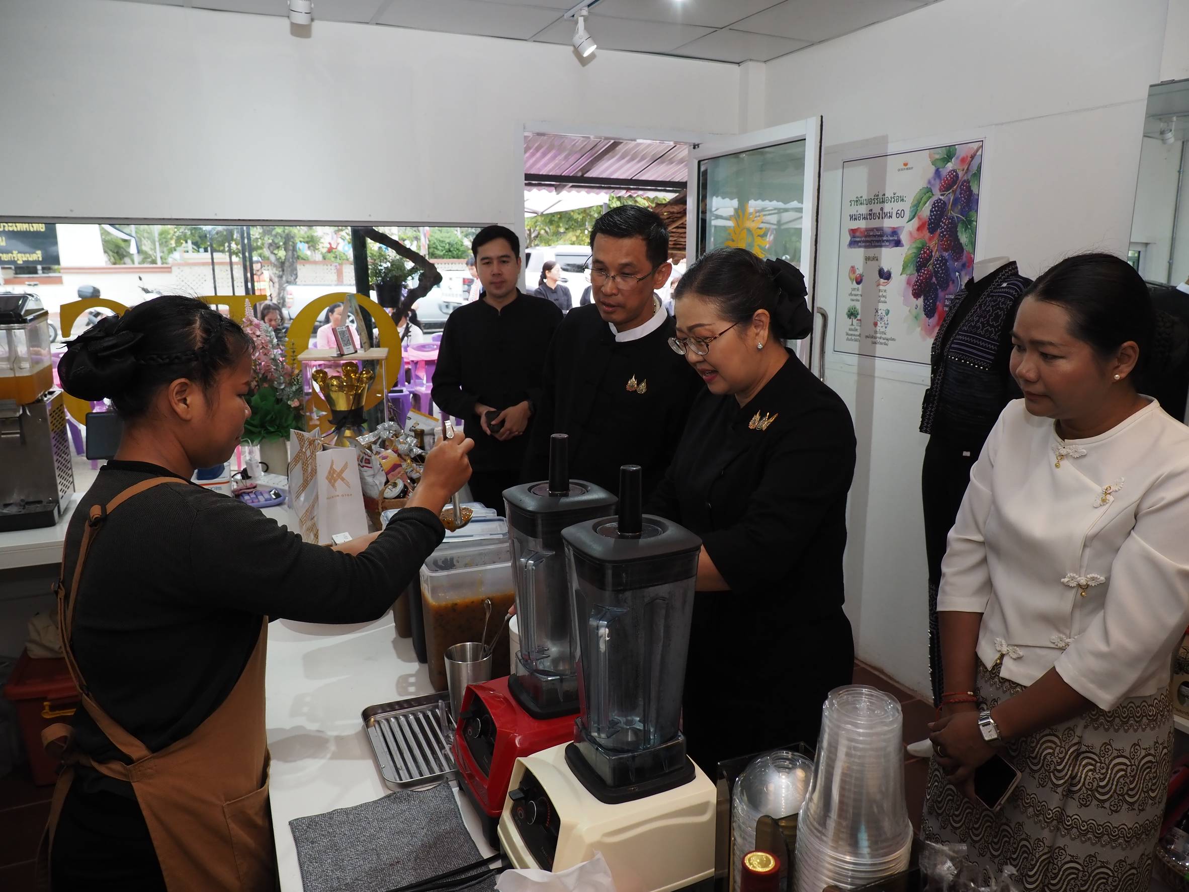 ในโอกาสนี้ ได้มีพิธีเปิดร้าน “Queen Berry Smoothie (QBS.)” อย่างเป็นทางการ โดยวิสาหกิจชุมชนกลุ่มแปรรูปผลิตภัณฑ์หม่อนไหมแม่ฮ่องสอน นำผลผลิตหม่อน–มัลเบอร์รีและผลผลิตท้องถิ่นมาต่อยอดเป็นเครื่องดื่มสุขภาพ พร้อมจัดแสดงผลิตภัณฑ์คุณภาพดีจากชุมชนและของฝากในเทศกาลต่าง ๆ โดยมุ่งสร้างมูลค่าเพิ่มและเพิ่มรายได้ให้เกษตรกรอย่างยั่งยืน