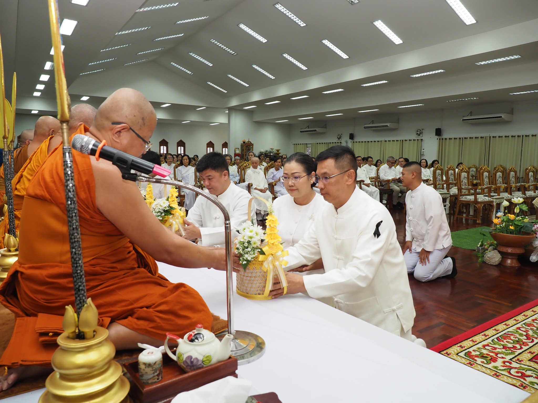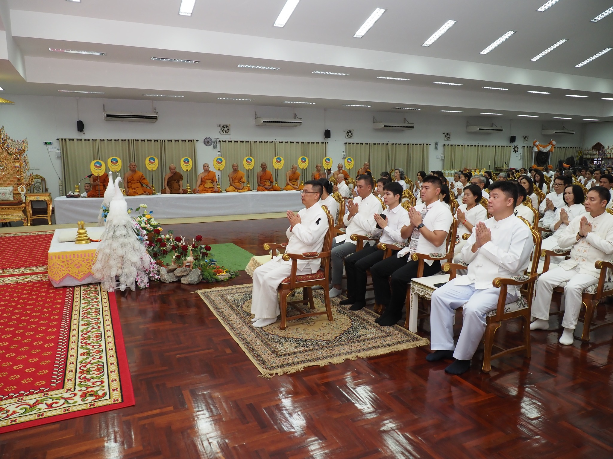 ภายในงานมีพิธีเจริญพระพุทธมนต์และเจริญจิตภาวนาถวายพระพรชัยมงคล แด่พระบาทสมเด็จพระเจ้าอยู่หัว และสมเด็จพระนางเจ้าฯ พระบรมราชินี ณ อาคารผู้สูงอายุ ก่อนร่วมพิธีทำบุญตักบาตร ณ ลานพระธาตุ โดยมีพระสุมณฑ์ศาสนกิตติ์ เจ้าคณะจังหวัดแม่ฮ่องสอน และเจ้าอาวาสวัดพระธาตุดอยกองมู นำพระสงฆ์และสามเณร จำนวน 22 รูป รับบิณฑบาตร