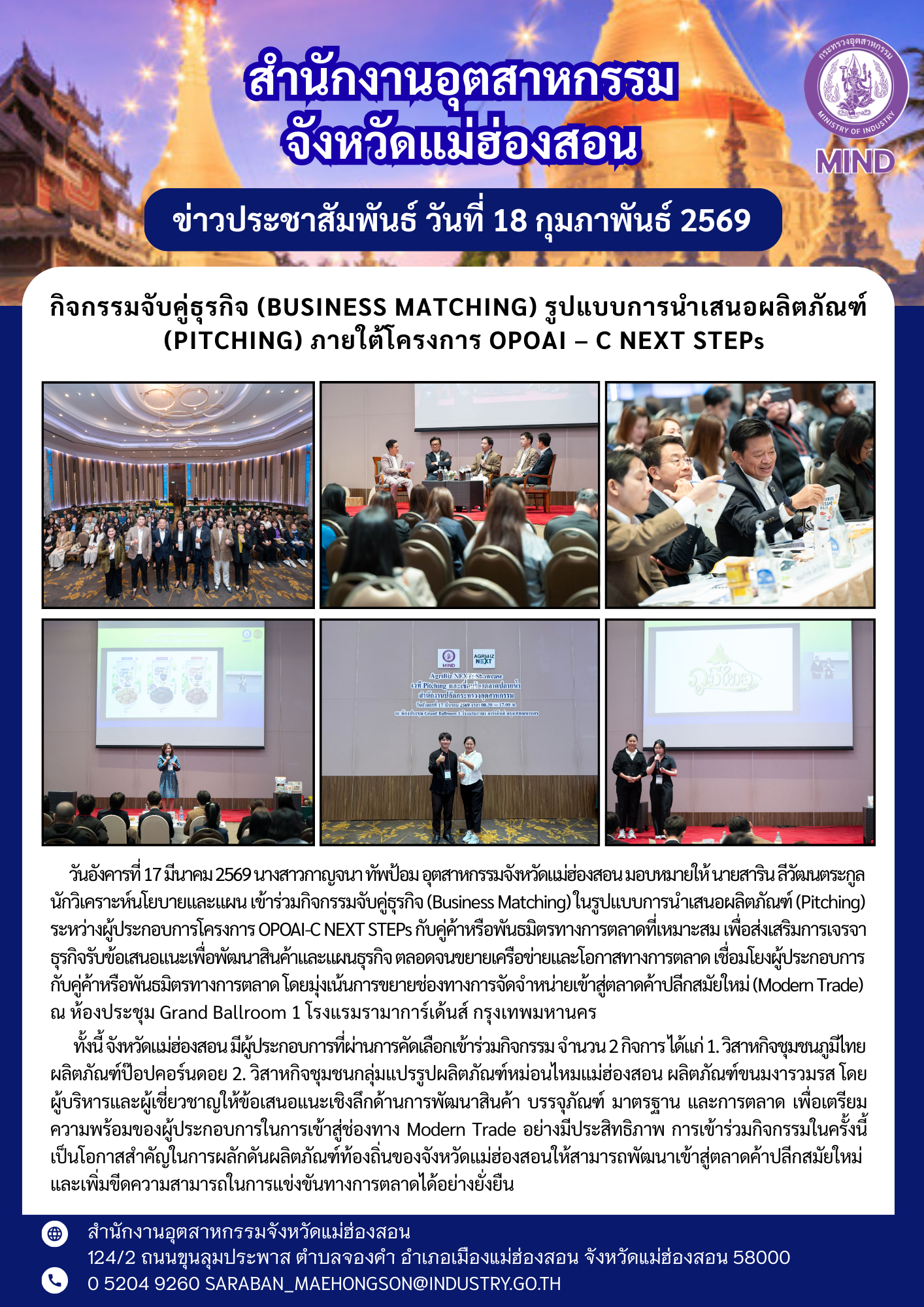 วันอังคารที่ 17 มีนาคม 2569 นางสาวกาญจนา ทัพป้อม อุตสาหกรรมจังหวัดแม่ฮ่องสอน มอบหมายให้ นายสาริน ลีวัฒนตระกูล นักวิเคราะห์นโยบายและแผน เข้าร่วมกิจกรรมจับคู่ธุรกิจ (Business Matching) ในรูปแบบการนำเสนอผลิตภัณฑ์ (Pitching) ระหว่างผู้ประกอบการโครงการ OPOAI-C NEXT STEPs กับคู่ค้าหรือพันธมิตรทางการตลาดที่เหมาะสม เพื่อส่งเสริมการเจรจาธุรกิจรับข้อเสนอแนะเพื่อพัฒนาสินค้าและแผนธุรกิจ ตลอดจนขยายเครือข่ายและโอกาสทางการตลาด เชื่อมโยงผู้ประกอบการกับคู่ค้าหรือพันธมิตรทางการตลาด โดยมุ่งเน้นการขยายช่องทางการจัดจำหน่ายเข้าสู่ตลาดค้าปลีกสมัยใหม่ (Modern Trade) ณ ห้องประชุม Grand Ballroom 1 โรงแรมรามาการ์เด้นส์ กรุงเทพมหานคร