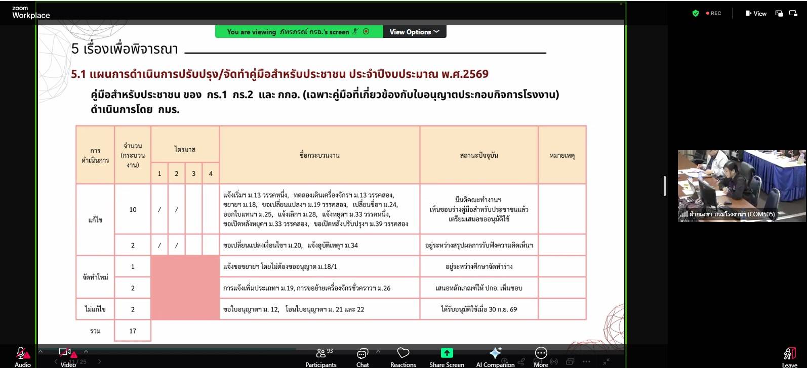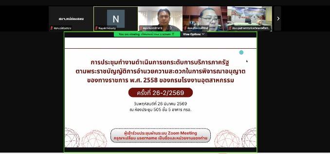 วันที่ 26 มีนาคม 2569 เวลา 9.30 น. นางสาวกาญจนา ทัพป้อม อุตสาหกรรมจังหวัดแม่ฮ่องสอน มอบหมายให้นายพงพนธ์ ออมแก้ว หัวหน้ากลุ่มโรงงานอุตสาหกรรม เข้าร่วมการประชุมคณะทำงานดำเนินการยกระดับการบริการภาครัฐ ตามพระราชบัญญัติการอำนวยความสะดวกในการพิจารณาอนุญาตของทางราชการ พ.ศ. 2558 ของกรมโรงงานอุตสาหกรรม ครั้งที่ 26-2/2569 จัดขึ้น ณ ห้องประชุม 505 ชั้น 5 อาคารกรมโรงงานอุตสาหกรรม และผ่านระบบออนไลน์ (Application Zoom Meeting) เพื่อพิจารณาปรับปรุงคู่มือสำหรับประชาชนที่เกี่ยวข้องกับใบอนุญาตประกอบกิจการโรงงาน