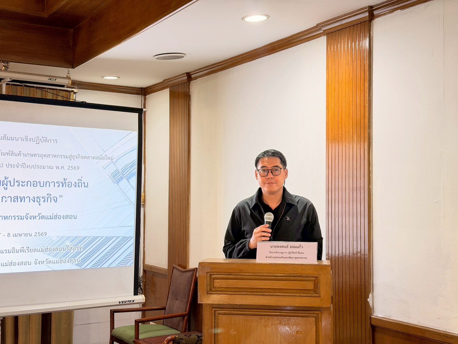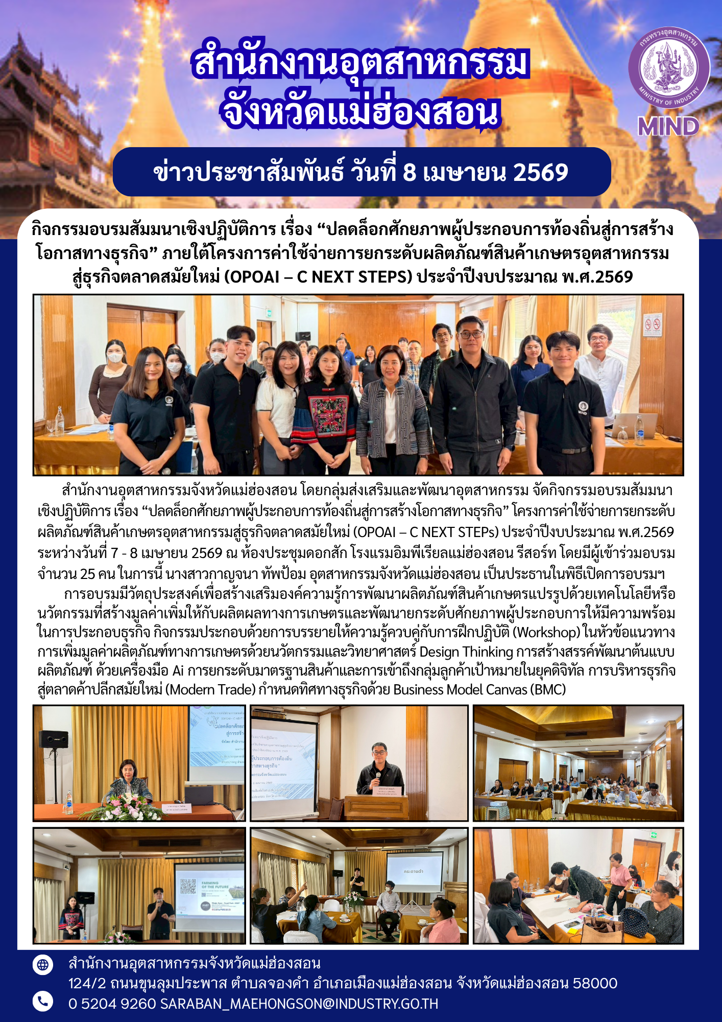สำนักงานอุตสาหกรรมจังหวัดแม่ฮ่องสอน โดยกลุ่มส่งเสริมและพัฒนาอุตสาหกรรม จัดกิจกรรมอบรมสัมมนาเชิงปฏิบัติการ เรื่อง “ปลดล็อกศักยภาพผู้ประกอบการท้องถิ่นสู่การสร้างโอกาสทางธุรกิจ” โครงการค่าใช้จ่ายการยกระดับผลิตภัณฑ์สินค้าเกษตรอุตสาหกรรมสู่ธุรกิจตลาดสมัยใหม่ (OPOAI – C NEXT STEPs) ประจำปีงบประมาณ พ.ศ.2569 ระหว่างวันที่ 7 - 8 เมษายน 2569 ณ ห้องประชุมดอกสัก โรงแรมอิมพีเรียลแม่ฮ่องสอน รีสอร์ท โดยมีผู้เข้าร่วมอบรม จำนวน 25 คน ในการนี้ นางสาวกาญจนา ทัพป้อม อุตสาหกรรมจังหวัดแม่ฮ่องสอน เป็นประธานในพิธีเปิดการอบรมฯ