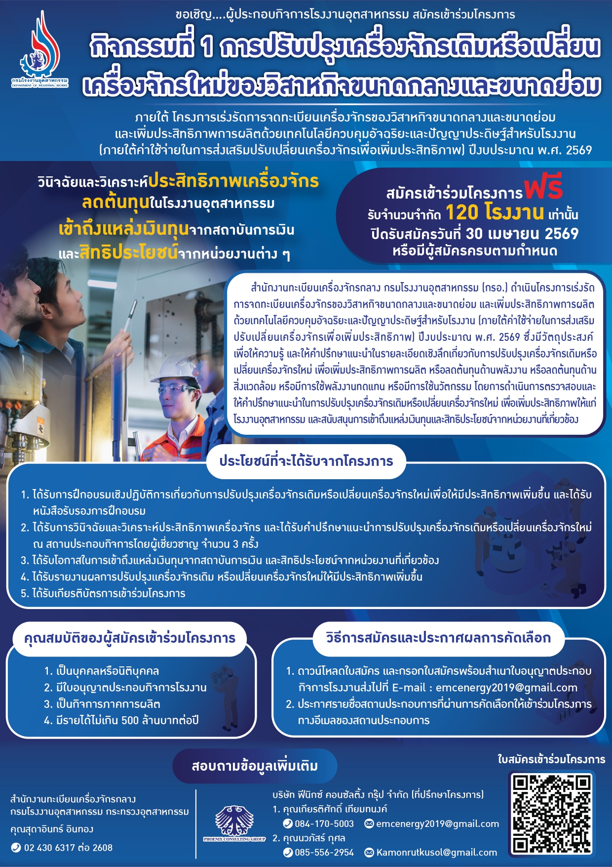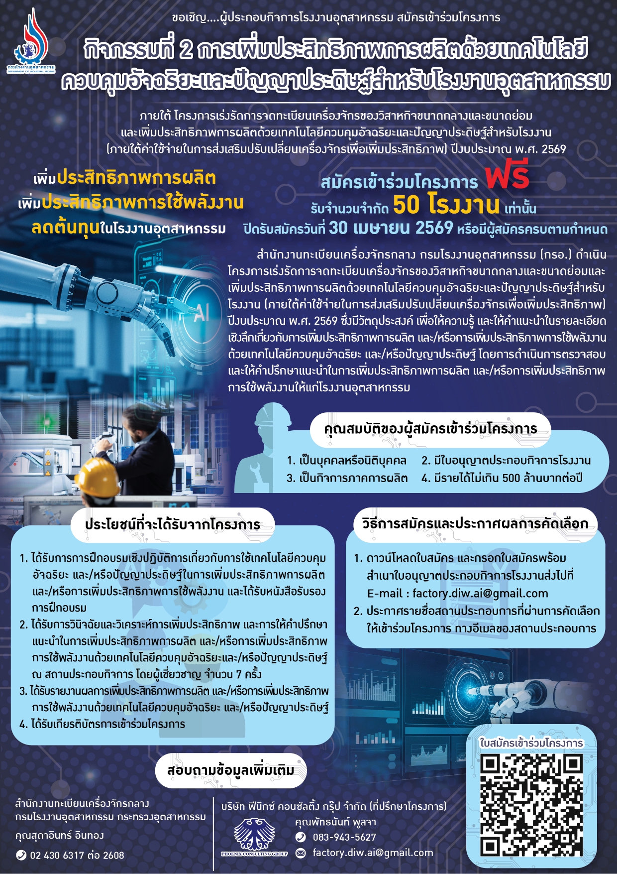 สมัครเข้าร่วมโครงการเร่งรัดการจดทะเบียนเครื่องจักรของวิสาหกิจขนาดกลางและขนาดย่อม และเพิ่มประสิทธิภาพการผลิตด้วยเทคโนโลยีควบคุมอัจฉริยะและปัญญาประดิษฐ์สำหรับโรงงาน (ภายใต้ค่าใช้จ่ายในการส่งเสริมปรับเปลี่ยนเครื่องจักรเพื่อเพิ่มประสิทธิภาพ) ประจำปีงบประมาณ พ.ศ. 2569
